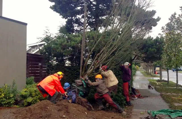 Apparently, this technology has been used by the military to excavate land mines. The process of air-excavating the tree from its original location was tedious. It took hours to gently remove the soil away from the root ball. Once we had freed the soil from the root ball, we brought in a crane to raise the plant and moved it into a truck where we then transplanted it into its new location.