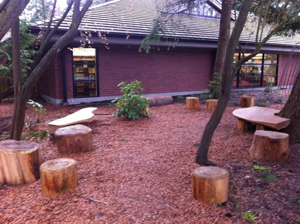 The Mercer Island Library worked with the Pomegranate Center to build a unique outdoor space that connects kids with nature and literacy. The landscape design does a lot with a relatively small space that surrounds the library.