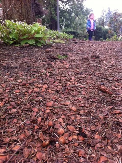 The paths are filled with empty hazelnut shells (yes, they come from Washington), and make for a fun crunching sound under feet.