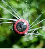 Rotating spray-head sprinkler nozzles are also a new innovation in irrigation technology (shown above in top photo). They apply water more slowly and evenly than conventional sprinkler nozzles. The nozzles shoot multi-trajectory, rotating streams that apply water more uniformly. The water that shoots out of these rotating nozzles is less likely to mist and more resistant to wind. Applying water slowly allows soil to absorb it without running off into the sidewalks and streets.