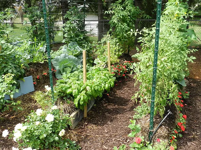 Vegetable garden with plants growing in rows on straw bales and soil, surrounded by green trees and fenced in the background.